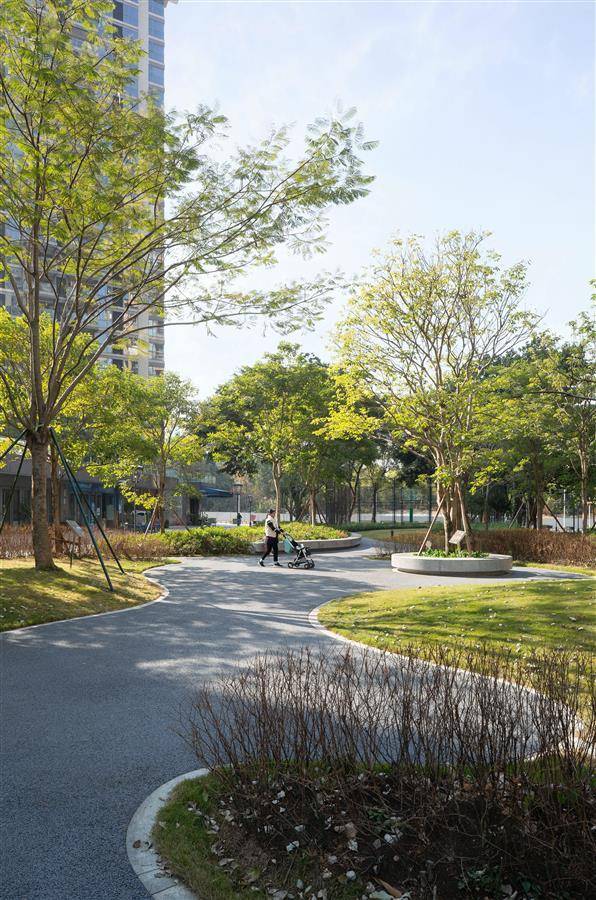 AUBE 欧博设计通过重点打造两条全新景观轴线,缝合、激活片区公共空间。自然活力轴创造生态自然街区,营造复合性功能场所,吸引人气,创造活力。设计通过保留现状长势良好的树木,在林下增加休憩活动空间,在硬质区域增加特色开花乔木和雨水花园,融入绿色生态理念和海绵城市生态功能,聚集人气、提升街区价值和活力。